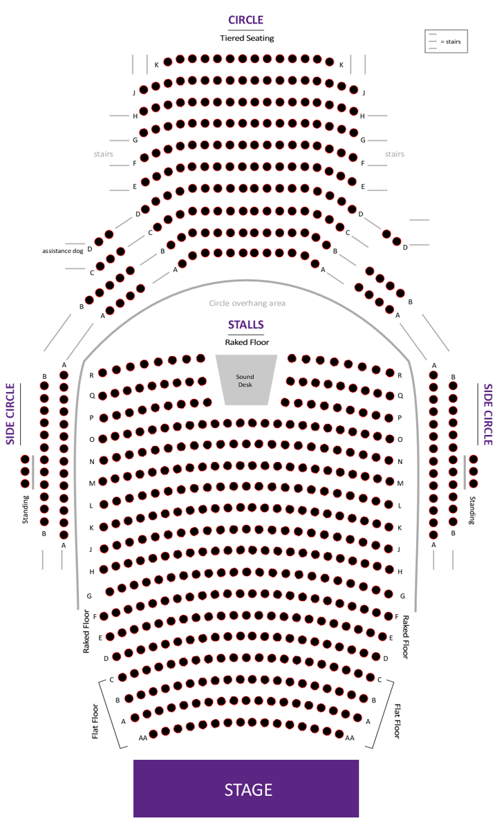 The circle is on the upper floor of the theatre and is accessed by stairs. The seating is fixed and raked. Customers are requested to remain seated during the performance.